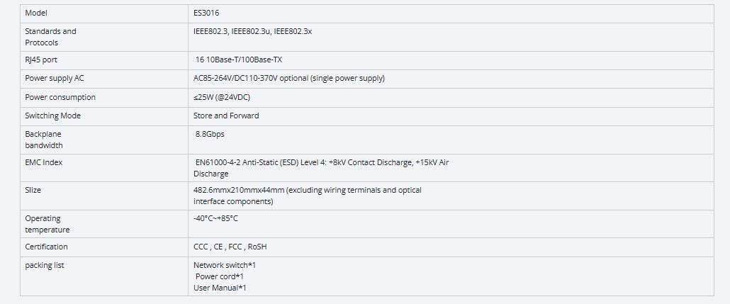 The industrial Ethernet switch adopts high-performance imported switching chip to ensure the stable transmission of large traffic data, and supports 10/100/100M adaptive electrical port; Support -40~85℃ operating temperature, industrial power protection, indicator status display, guide rail/rack installation, fan-less thermal housing design, to achieve real readout, convenient and fast, but also meet the EMC4 level protection, IP40 protection, 6000V lightning protection and other indicators, can adapt to a variety of harsh industrial environment application needs. ● Support 16 10/100M adaptive electrical ports ● Support -40 ~ 75 ℃ wide temperature work ● IP40 protection, EMC4 level protection, 4000V Lightning protection ● Standard rack-mounted installation, both front and rear can go out ● Support power status relay alarm output ● Support AC85-264V/DC110-370V supply electric, optional dual power supply