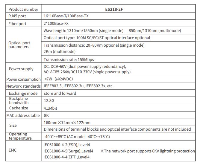The industrial Ethernet switch adopts high-performance imported switching chip to ensure the stable transmission of large traffic data, and supports 10/100/100M adaptive electrical port; Support -40~85℃ operating temperature, industrial power protection, indicator status display, guide rail/rack installation, fan-less thermal housing design, to achieve real readout, convenient and fast, but also meet the EMC4 level protection, IP40 protection, 6000V lightning protection and other indicators, can adapt to a variety of harsh industrial environment application needs. ● 10/100BaseT(X) (RJ45 Connector), 100BaseF(X) (Single/Multi-mode, SC/ST/FC Connector) ● IP40 Aluminum Alloy Shell with Fanless Design ● Support Power-down Status Reply Alarm Output ● Working Temperature -40 to 85°C ● Satisfy Harsh Industrial Environment